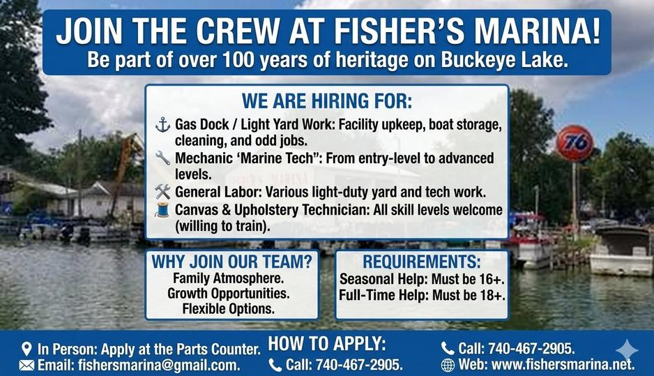 We are hiring for multiple positions from full time to part time / seasonal. Please contact us today for more info or apply in person. Come work with a family that will work right along side everyone each and everyday & never ask someone to do something there not willing to do themselves. Fisher's Marina,LLC is truly a family business. If your willing to learn we are allows willing to teach and train staff. This allows for current & new staff to learn new skills & move-up, grow with our family. We believe that we have to keep growing, learning and improving to keep up with the demands of tomorrow. We look forward to hearing from you soon. Thank you for your time Fisher's Marina The Fisher Family.